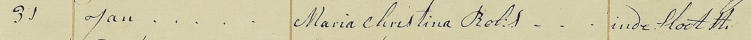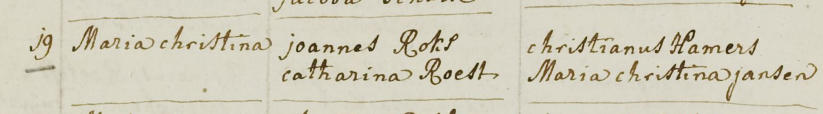 Parenteel RoksGeneratie IIMaria Christina Roks [1.6], Maria is gedoopt op woensdag 19 april 1775 in Amsterdam. Dochter van Joannes Roks en Catharina Roest. Geloof: Rooms Katholiek.Dit is een kopie uit het doopregister van de RK Kerk "De Toren" te Amsterdam.Tekst Doopregister: 19 april 1774, gedoopt Maria Christina, dochter uit een voor de kerk gesloten huwelijk geboren, ouders Joannes Roks en Catharina Roest. De doopgetuigen waren : Christianus Hamers en Maria Christina Jansen.Zij is begraven op woensdag 31 mei 1775, iets meer dan 1 maand oud.DatumNaam VaderNaam overledeneAdresDit is een kopie uit het begraafregister van het Karthuizer kerkhof in Amsterdam.Jan(Joannes) Roks woonde toen in de Slootstraat in Amsterdam.