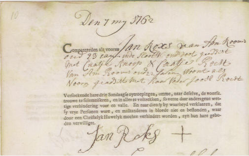 Op 7 mei 1762 verschenen voor mij Jan Roxs geboren in Amsterdam, geloof Rooms, 23 jaar oud,