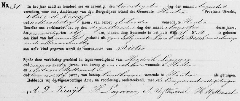 Pieter is geboren op zaterdag 19 augustus 1876 om 11:00 uur in het huis Wijk J no. 10 te Houten,