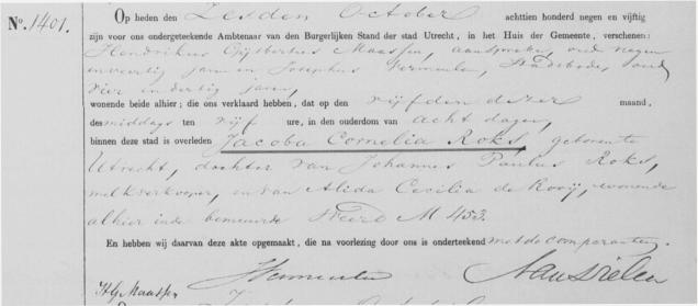 Jacoba is overleden op woensdag 5 oktober 1859 om 17:00 uur wonende aan de bemuurde