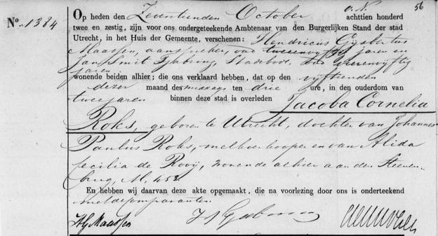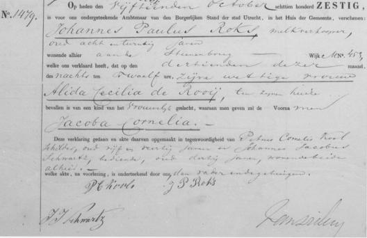Parenteel RoksGeneratie VJacoba Cornelia Roks [1.4.4.2.3],Jacoba is geboren op zaterdag 13 oktober 1860 om twaalf uur wonende alhier aan de Steenenbrug Wijk M No.453 in Utrecht , dochter van Johannes Paulus Roks.[zie 1.4.4.2], en Alida Cecilia de Rooij. Van de geboorte is aangifte gedaan op maandag 15 oktober 1860 met als getuigen: Petrus Cornelis Kool (schilder) oud vijf en veertig jaren en Johannes Jacobus Schwartz (bediende), oud dertig jaren, wonende beide alhier. Aangifte van de geboorte is gedaan door Johannes Paulus Roks, van beroep melkverkooper, oud acht en twintig jaren.Jacoba is overleden op woensdag 15 oktober 1862 om 15:00 uur wonende aan den Steenenbrug no 453 te Utrecht, 2 jaren oud. Getuigen van het passeren van de akte van overlijden waren: Hendrikus Gijsbertus Maassen(aanspreker) oud twee en vijftig jaren en Jan Smit Tjabring(stadsbode) oud vier en vijftig jaren, wonende beiden alhier.