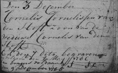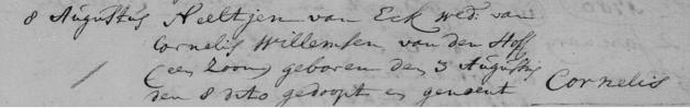 Parenteel van den Hof(f)Generatie IICornelis Cornelissen van den Hoff [1.10],hij is geboren op dinsdag 3 augustus en gedoopt op zondag 8 augustus 1779 in Renkum. Zoon van Cornelis Willemsen van den Hoff [1] en Neeltjen van Eck. Cornelis is overleden op zondag 3 december en begraven op donderdag 7 december 1786 in Renkum, 7 jaar oud.Geloof: Gereformeerd.•Zijnvaderwasop10april voor zijn geboorte overleden.