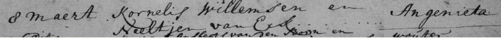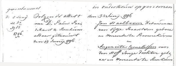 Parenteel van den Hof(f)Generatie IIAngenieta van den Hoff [1.4],zij is gedoopt op zondag 8 maart 1767 in Renkum. Dochter van Cornelis Willemsen (van den Hoff) [1] en Neeltjen van Eck.Angenieta is overleden op donderdag 14 januari 1841 in Bennekom, 73 jaar oud.Geloof: Gereformeerd.Beroep: onbekend.Angenieta trouwde, 29 jaar oud, op zondag 19 juni 1796 te Renkum met,Jan Haalboom, 39 jaar oud.Jan is gedoopt op zondag 3 april 1757 in Bennekom. Zoon van Peter Haalboom en Teunisje Aarts.Jan is overleden op zaterdag 11 juli 1818 in Bennekom, 61 jaar oud.Geloof: Gereformeerd.Kinderen van Angenieta en Jan:1.Fijtje Haalboom. Zij is gedoopt op 02-04-1797 en overleden op 13-09-1835, in Bennekom.2.Cornelis Haalboom. Hij is gedoopt op 26-08-1798 in Bennekom.3.Peter Haalboom. Hij is gedoopt op 22-06-1800 in Bennekom.4.Neeltje Haalboom. Zij is geboren omstreeks 1802 en overleden op 28-08-1868 in Beekbergen.5.Willem Haalboom. Hij is geboren omstreeks 1805.