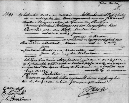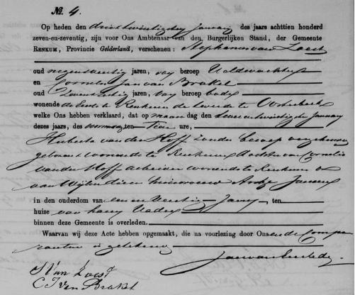 Parenteel van den Hof(f)Generatie IVHuberta van den Hoff [1.6.1.4],zij is geboren op maandag 12 oktober 1835 om 06:00 uur in Renkum. Dochter van Cornelis van den Hoff [1.6.1] en Antje Janssen.Geloof: onbekend.Beroep: geenIk kan geen gegevens vinden over een huwelijk.Huberta is overleden op maandag 22 januari 1877 om 10:00 uur in Renkum.