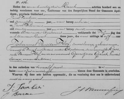 Parenteel van den Hof(f)Generatie VJohannes van den Hof [1.6.2.2.1],hij is geboren op vrijdag 12 juni 1868 om 23:00 uur in Apeldoorn. Zoon van Gerrit van den Hof [1.6.2.2] en Gerritje de Groot.Johannes is overleden op vrijdag 18 maart 1881 om 05:00 uur in Brink en Orden (Apeldoorn), 12 jaar oud.