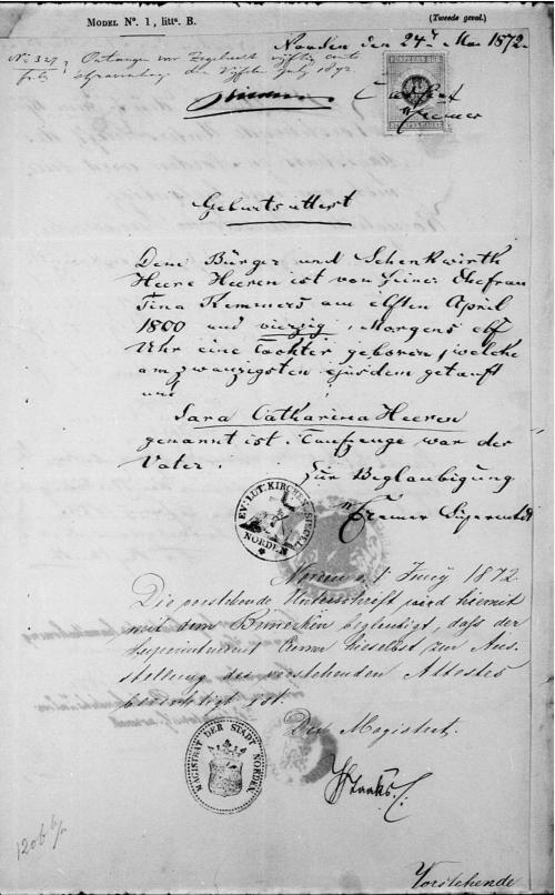 is geboren op zaterdag 11 april en gedoopt op 20 april 1840 in Norden, Duitsland.