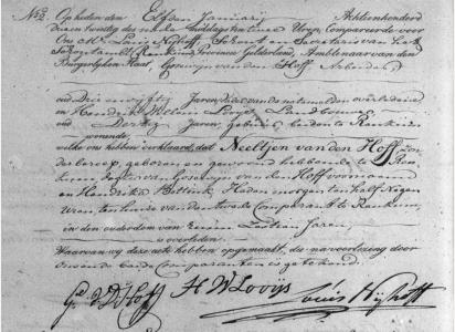 Parenteel van den Hof(f)Generatie IIINeeltjen van den Hof [1.6.3],zij is geboren op woensdag 3 december 1806 in Renkum.Dochter van Gozewijn Cornelissen van den Hoff [1.6] en Henderika Bettink. Neeltjen is overleden op zaterdag 11 januari 1823, 16 jaar oud.Geloof: Gereformeerd.•Zij was geboren als helft van een tweeling.